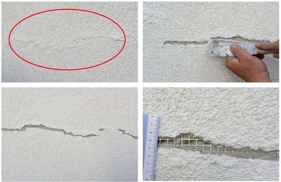 Fot. 1-2 Spękania elewacji wzdłuż połączenia wełny mineralnej ze styropianem, Atlas