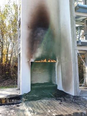 Fot. Ogień wydobywający się ze strefy pasa z wełny po zakończeniu badania i ugaszeniu źródła ognia po badaniach ICIMB. PSPS